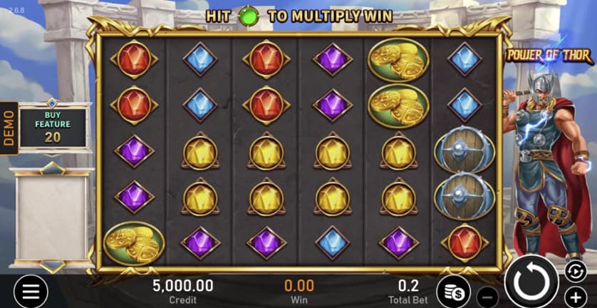 Begitu masuk ke arena permainan, kamu langsung disambut suasana ala medan pertempuran mitologi. Awan gelap, batu bersinar, dan tentu saja sang dewa petir—Thor, lengkap dengan palu keramatnya: Mjölnir.